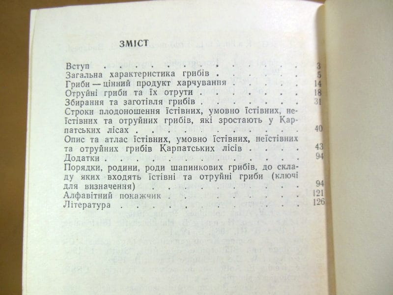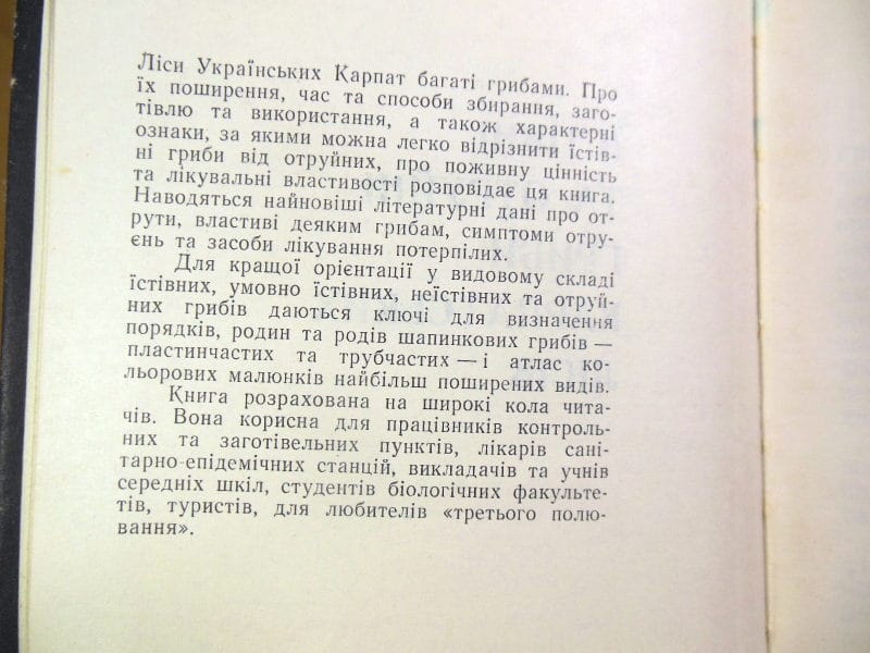 Ліси Українських Карпат багаті грибами. Про їх поширення, час та способи збирання, заготівлю та використання, а також характерні ознаки, за якими можна легко відрізнити їстівні гриби від отруйних, про поживну цінність та лікувальні властивості розповідає ця книга. Наводяться дані про отрути, властиві деяким грибам, симптоми отруєнь та засоби лікування потерпілих. Для кращої орієнтації у видовому складі їстівних, умовно їстівних, неїстівних та отруйних грибів даються ключі для визначення порядків, родин та родів шапкових грибів — пластинчастих та трубчастих — і атлас кольорових малюнків найпоширеніших видів.
