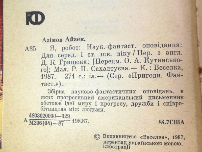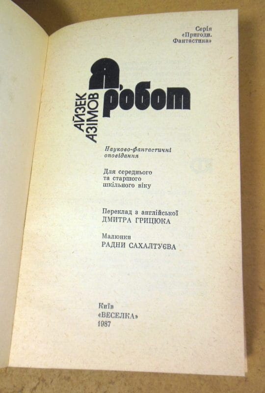 Азімов Айзек. Я, робот. Серія: Пригоди. Фантастика. Науково-фантастичні оповідання. Малюнки Р. Сахалтуєва. Київ. Веселка. 1987г. 271 с., іл.. Палiтурка тверда, Зменшений формат.