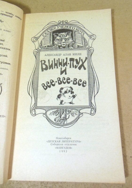 Милн А А. Винни-пух и все-все-все. Повесть-сказка. Пересказ с англ. Б.Заходера. Худ.Э.В.Назаров. Серия: Сказки кота ученого. Новосибирск: Дет.лит.- Мангазея, 1993г. 224с.с илл. Мягкая иллюстративная издательская обложка, обычный формат
