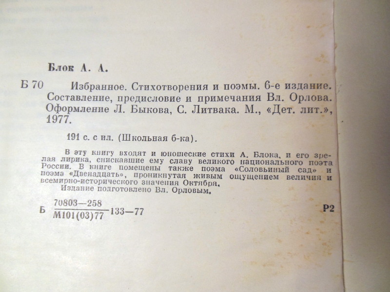 Александр Блок. Избранное. Стихотворения и поэмы. М.: Детская литература, 1977. 191 с. Твердый переплет, Обычный формат.
