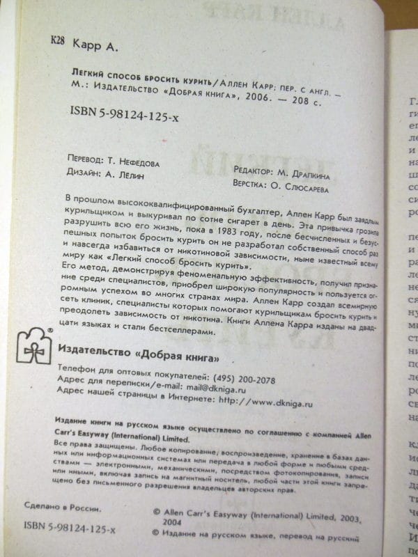 Карр Аллен. Легкий способ бросить курить. М. Добрая книга. 2006г. 208 с., илл. Мягкий переплет, Обычный формат.
