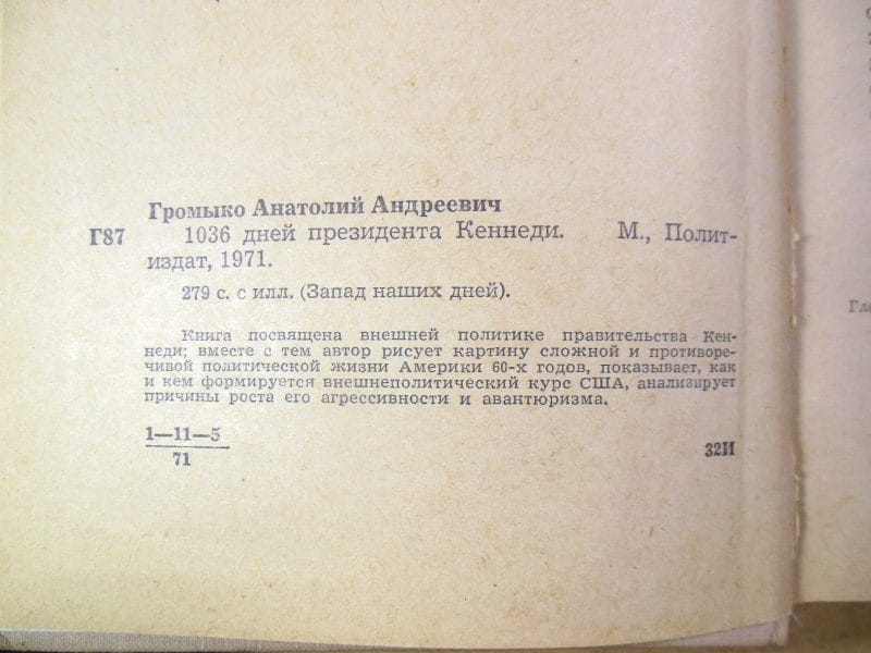 Громыко А. 1036 дней президента Кеннеди. М. Политиздат. 1971г. 280с., 281с. Твердый переплет, Обычный формат.
