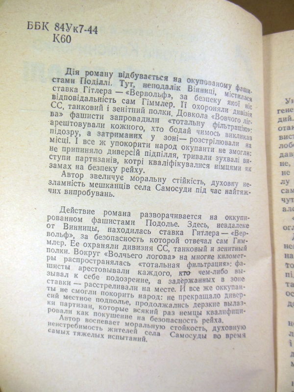 Роман-легенда присвячений героїчній боротьбі українського народу проти фашистських загарбників у роки Другої світової війни. Події розгортаються на окупованому Поділлі, неподалік Вінниці, де знаходилася ставка Гітлера «Вервольф». Автор звеличує моральну стійкість та духовну незламність мешканців села Самосуди, які попри «тотальну фільтрацію» та жорстокий режим окупантів, продовжують чинити опір, допомагаючи партизанам та підпіллю.