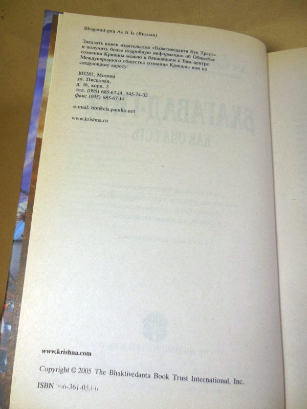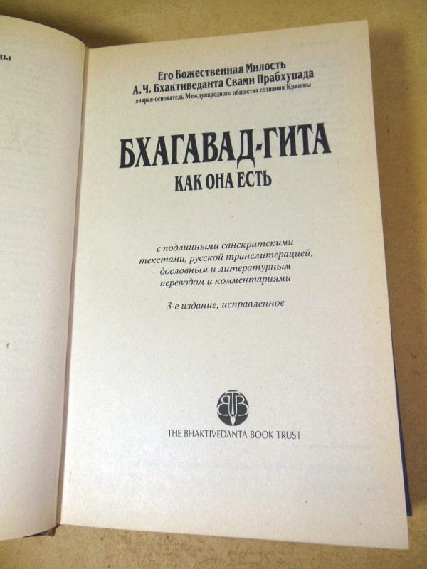Шри Шримад А.Ч. Бхактиведанта Свами Прабхупада Бхагавад-гита как она есть. 3-е издание, исправленное. Полное издание с подлинными санскритскими текстами, русской транслитерацией, дословным и литературным переводами и подробными комментариями. М. Бхактиведанта Бук Траст 2005г. 815 стр. Твердый переплет, Обычный формат.
