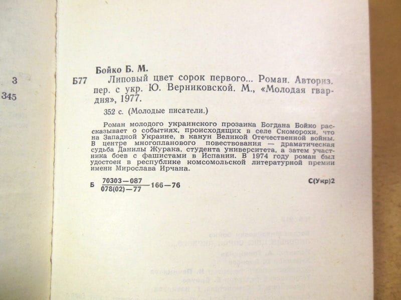 Роман украинского прозаика Богдана Бойко рассказывает о событиях, происходящих в селе Скоморохи, что на Западной Украине, в канун Великой Отечественной войны. В центре многопланового повествования — драматическая судьба Данилы Журака, студента университета, а затем участника боев с фашистами в Испании. В 1974 году роман был удостоен в республике комсомольской литературной премии имени Мирослава Ирчана. СОДЕРЖАНИЕ: Липовый цвет сорок первого… (роман): О себе и о книге (послесловие).