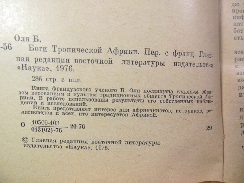 Книга французского ученого Б. Оля посвящена главным образом верованиям и культам традиционных обществ Тропической Африки. В работе использованы результаты его собственных наблюдений и исследований. Книга представляет интерес для африканистов, историков, религиоведов и всех, кто интересуется Африкой. СОДЕРЖАНИЕ: Человек перед лицом сакрального. Бог и боги в Тропической Африке. Иерархический порядок невидимого мира. Мифы о происхождении мира. Великий зодчий и управители мира. Существует ли в Тропической Африке эзотерической учение? Предки — стражи общественного порядка. Обряды инициаций. Культовые объединения. О колдунах. Гадатели, охотники за колдунами и исцелители. Ритуальные изображения. Под знаком полумесяца. Крест миссионера. Сепаратистские движения христианского направления. Проблемы существования и религиозность. Догматика, литургическое действо и жертвоприношения. Религиозная община — фактор общественного единства. Духовная мысль и эволюция. Послесловие.