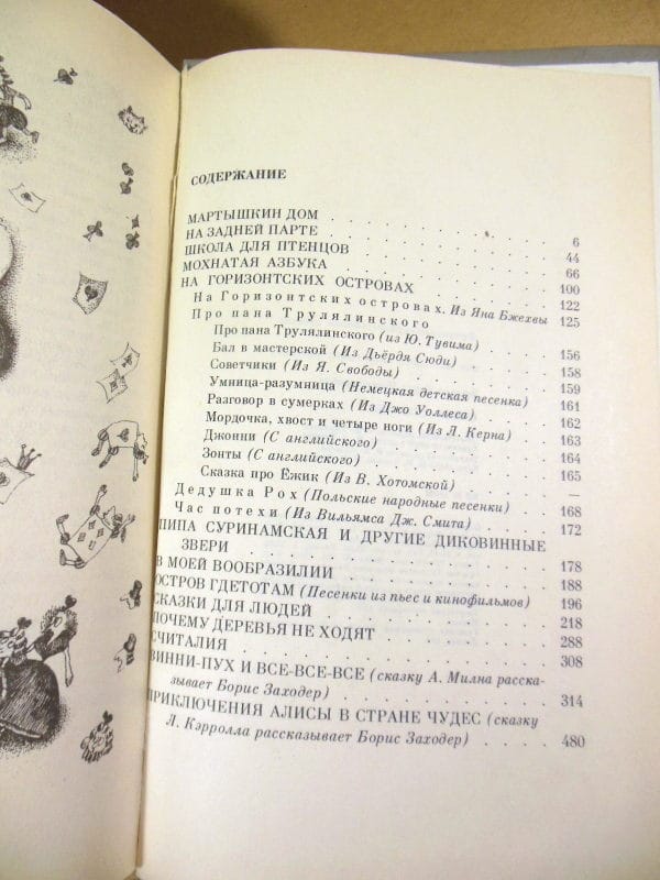 Издание включает в себя стихи и сказки Б. Заходера, его многочисленные переводы с разных языков, песенки из кинофильмов и мультфильмов, а также ставшие уже классикой пересказы Винни-Пуха и Алисы. Книга со вкусом иллюстрирована. Содержание: Мартышкин дом: На задней парте: Школа для птенцов: Мохнатая азбука: На Горизонтских островах: Про пана Трулялинского: Дедушка Рох: Час потехи: Пипа суринамская и другие диковинные звери: В моей Вообразилии: Остров Гдетотам: Сказки для людей: Почему деревья не ходят: Считалия: Винни-Пух и все-все-все: Приключения Алисы в стране чудес.