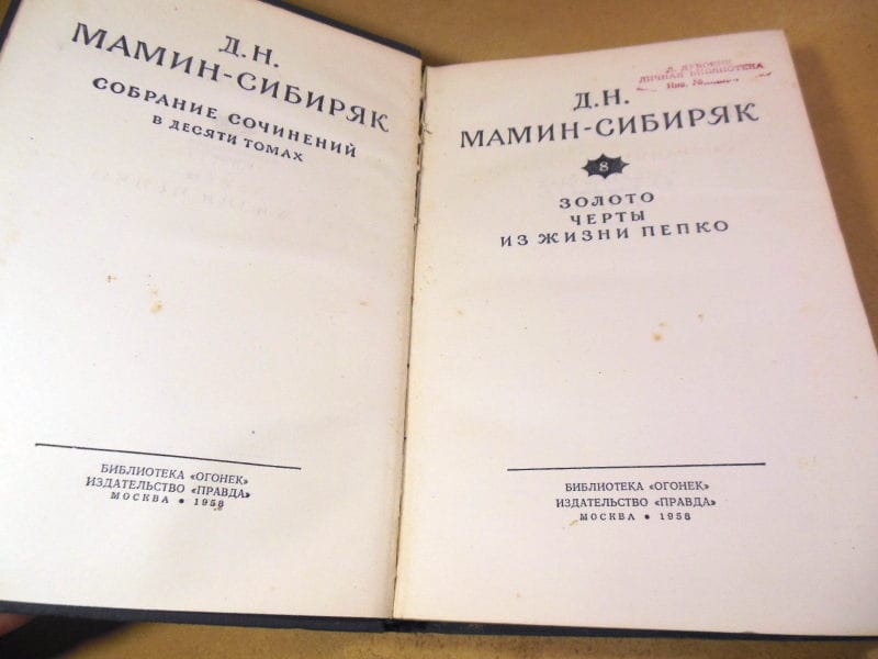 Мамин-Сибиряк Д.Н. Собрание сочинений в десяти томах. Том 8. Золото. Черты из жизни Пепко. Серия: Библиотека «Огонек». Иллюстрации П.Я. Караченцова. М. Правда. 1958 г. 448 с. Твердый переплет, немного увеличенный формат.