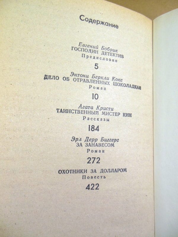 В сборник вошли ранее не издаваемые произведения признанных и малоизвестных мастеров детективного жанра А. Кристи, Э.Б. Кокса, Э.Д. Биггерса. Содержание: Е. Бобрик – Господин детектив (предисловие): Э.Б. Кокс – Дело об отравленных шоколадках (роман): А. Кристи – Таинственный Мистер Кин (рассказы): Э.Д. Биггерс – За занавесом (роман), Охотники за долларом (повесть).