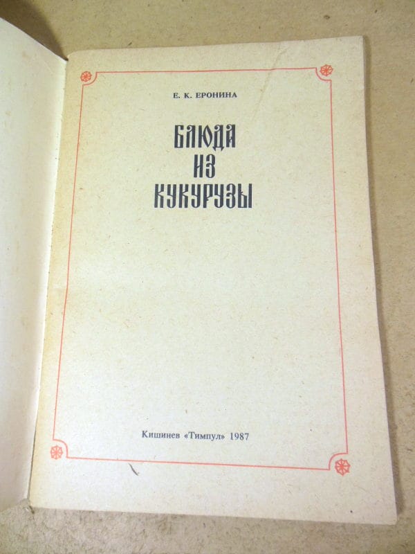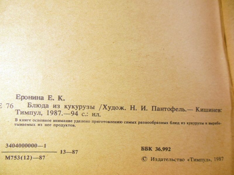 Блюда из кукурузы / Е. К. Еронина ; Худож. Н. И. Пантофель. — Кишинев: Тимпул, 1987. — 94 с.: ил. Мягкий переплет, обычный формат.