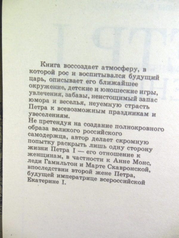 Книга воссоздает атмосферу, в которой рос и воспитывался будущий царь, описывает ближайшее его окружение, детские и юношеские игры, увлечения, забавы, неистощимый запас юмора, веселья, неуемную страсть Петра к всевозможным праздникам и увеселениям. Не претендуя на создание полнокровного образа великого русского самодержца, автор делает скромную попытку раскрыть лишь одну сторону жизин Петра — его отношение к женщинам, в частности к Анне Монс, леди Гамильтон и Марте Скавронской, впоследствии второй жене Петра, будущей императрице всероссийской Екатерине I.