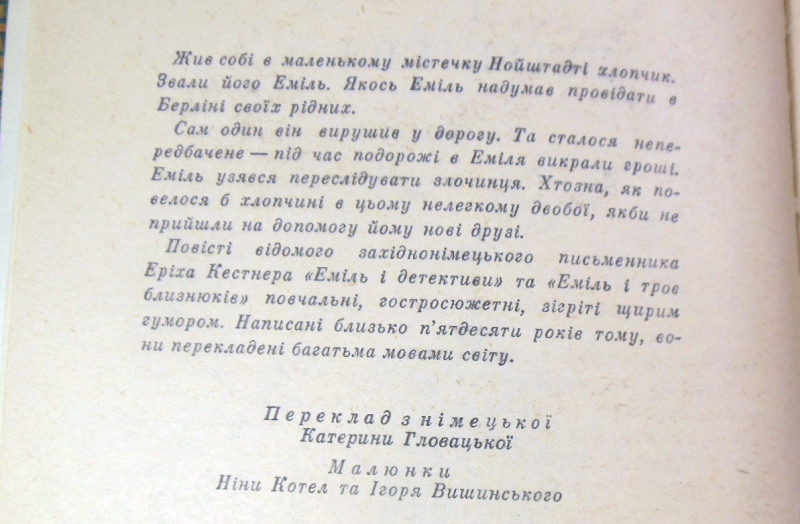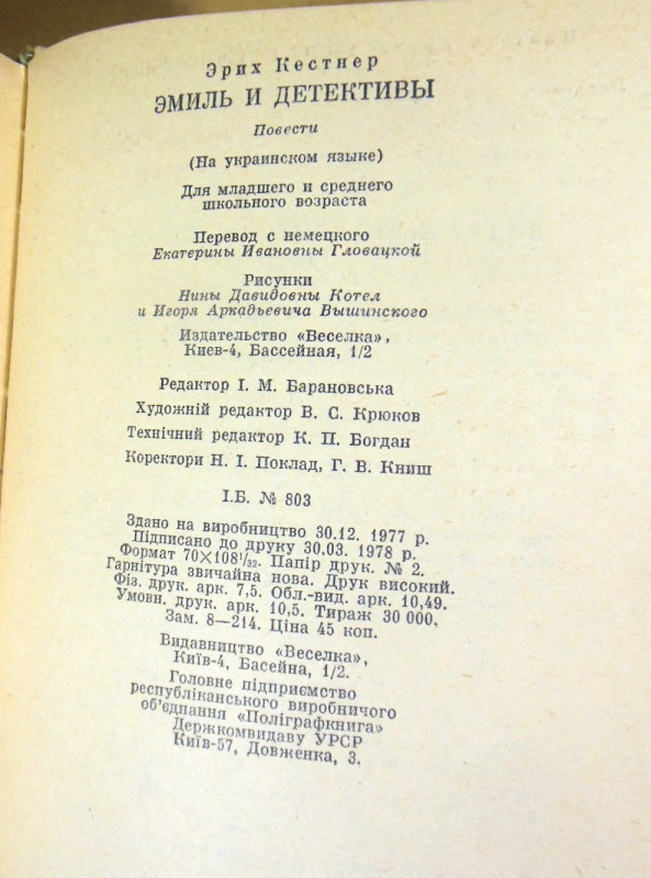 Еріх Кестнер. Еміль і детективи. Еміль і троє близнюків. Київ: Веселка, 1978. 239 с. Тверда палітурка, зменшений формат.