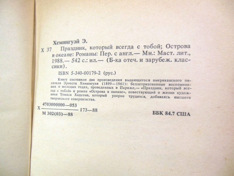 Хемингуэй Э. Праздник который всегда с тобой. Острова в океане. Романы. Минск. Мастацкая лiтаратура 1988г. 542 с., ил. Твердый переплет, обычный формат.