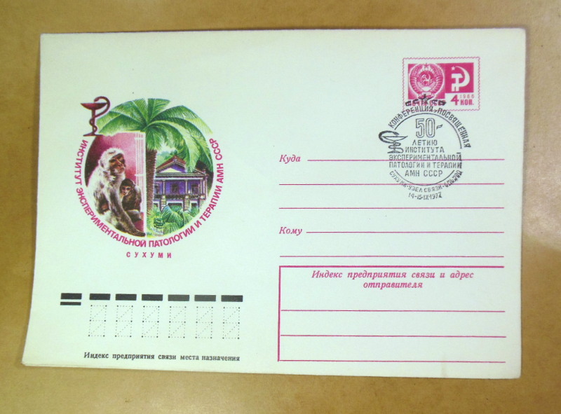 Тематика: Наука, медицина, ювілеї, НДІ експериментальної патології та терапії, Сухумський мавпячий розплідник, художній штемпель.