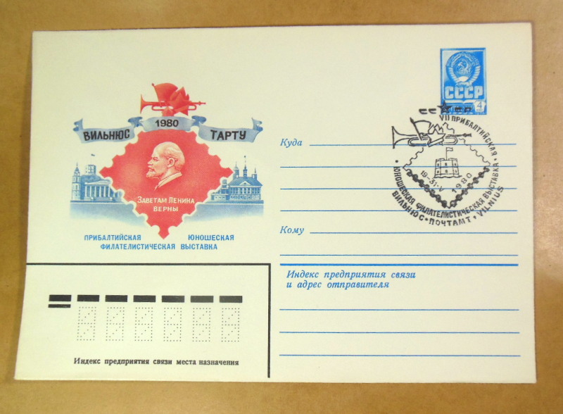 Тематика: Філателія, виставки, IX Прибалтійська філателістична виставка, архітектура Вільнюса, художній штемпель.