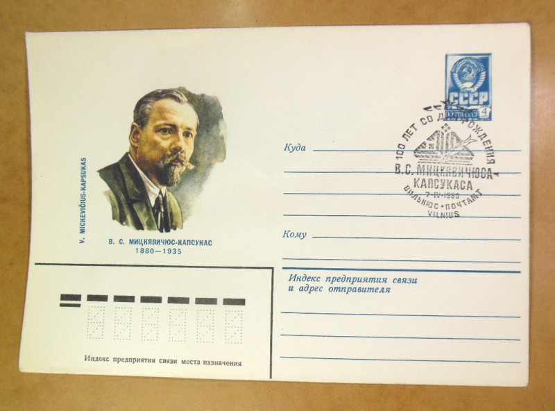 Тематика: Видатні особистості, політичні діячі, Вінцас Міцкявічюс-Капсукас, ювілеї, художній штемпель.