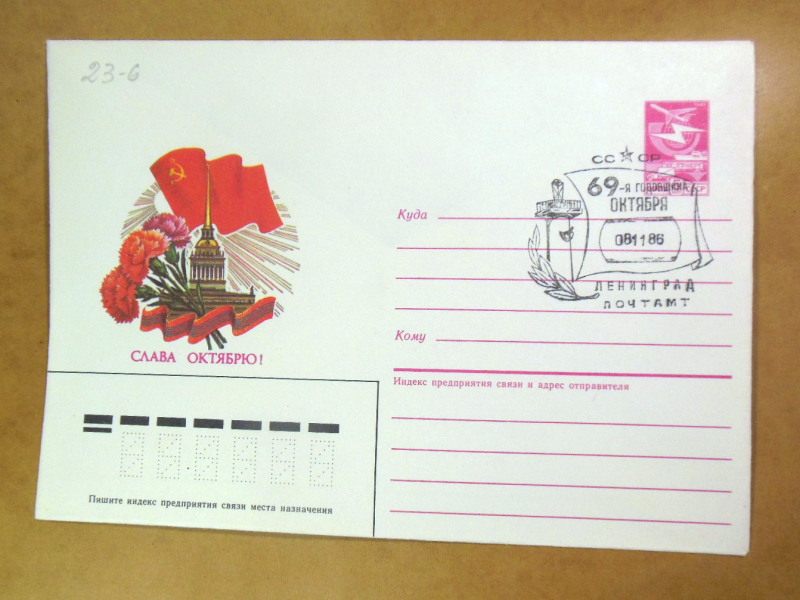 Тематика: Жовтнева революція, 69-а річниця, Адміралтейство, прапор, квіти, художній штемпель