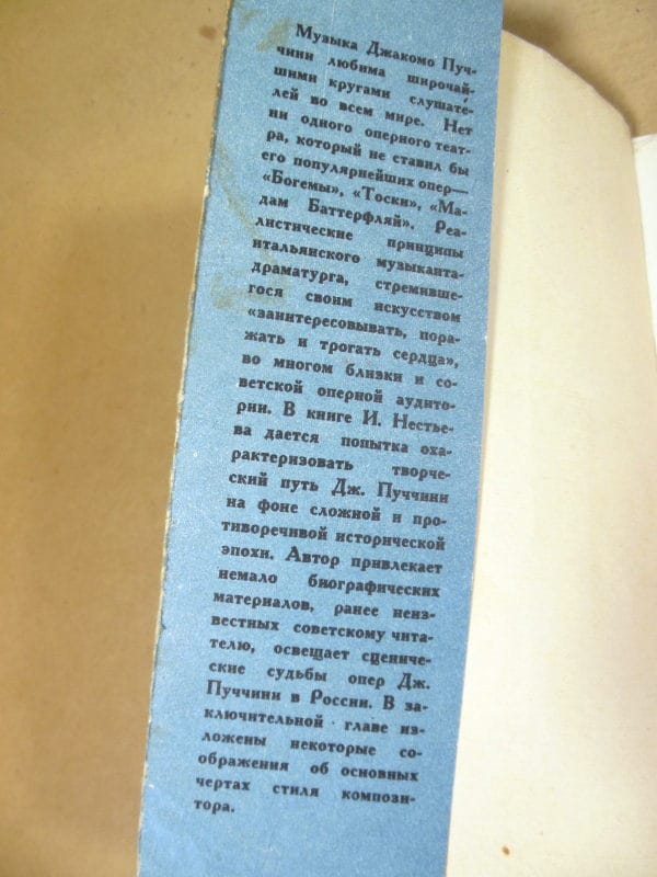 Музыка Джакомо Пуччини любима широчайшими кругами слушателей во всем мире. Нет ни одного оперного театра, который не ставил бы его популярнейших опер — *Богемы*, *Тоски*, *Мадам Баттерфляй*. Реалистические принципы итальянского музыканта-драматурга, стремившегося своим искусством заинтересовывать, поражать и трогать сердца, во многом близки и советской оперной аудитории. В книге И. Нестьева дается попытка охарактеризовать творческий путь Пуччини на фоне сложной и противоречивой исторической эпохи. Автор привлекает немало биографических материалов, ранее неизвестных советскому читателю, освещает сценические судьбы опер Пуччини в России. В заключительной главе изложены некоторые соображения об основных чертах стиля композитора.