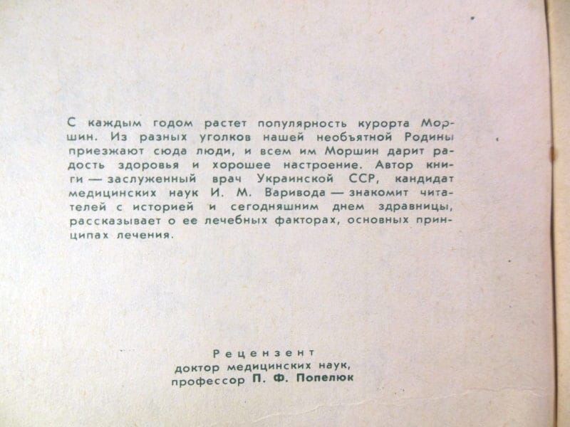 С каждым годом растет популярность курорта Моршин. Из разных уголков нашей страны приезжают сюда люди, и всем Моршин дарит радость здоровья и хорошее настроение. Автор книги — заслуженный врач Украинской ССР, кандидат медицинских наук И. М. Варивода — знакомит читателей с историей и сегодняшним днем здравницы.