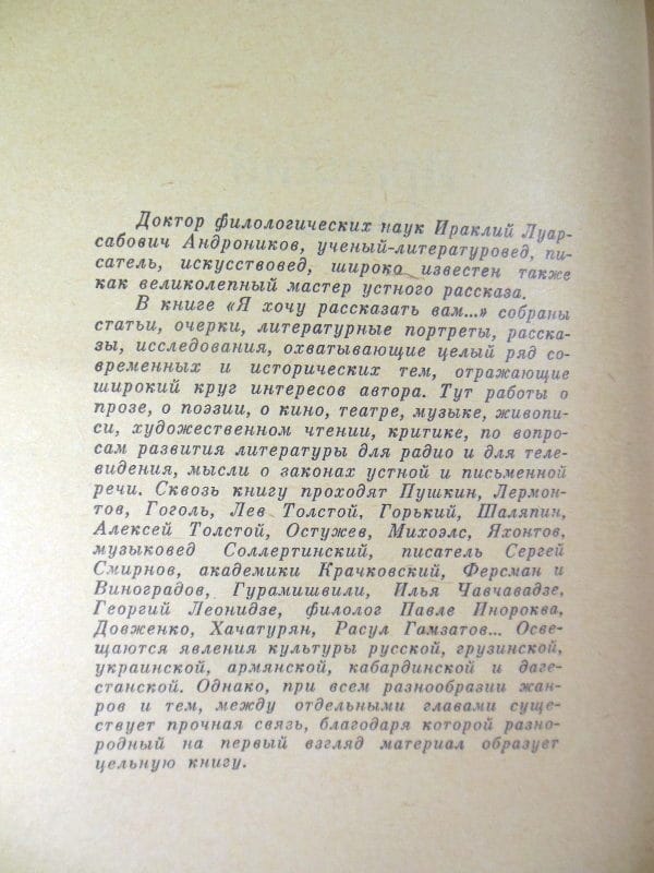 Доктор филологических наук Ираклий Луарсабович Андроников, ученый-литературовед, писатель, искусствовед, широко известен также как великолепный мастер устного рассказа. В книге “Я хочу рассказать вам …” собраны статьи, очерки, литературные портреты, рассказы, исследования, охватывающие целый ряд современных и исторических тем, отражающих широкий круг интересов автора. Тут работы о прозе, о поэзии, о кино, театре, музыке, живописи, художественном чтении, критике, по вопросам развития литературы для радио и для телевидения, мысли о законах устной и письменной речи. Сквозь книгу проходят Пушкин, Лермонтов, Гоголь, Лев Толстой, Горький, Шаляпин, Алексей Толстой, Отстужев, Михоэлс, Яхонтов, музыковед Соллертинский, писатель Сергей Смирнов, академики Крачковский, Ферсман и Виноградов, Гурамишвили, Илья Чавчавадзе, Георгий Леонидзе, филолог Павле Ингороква, Довженко, Хачатурян, Расул Гамзатов…. Освящаются явления культуры русской, грузинской, украинской, армянской, кабардинской и дагестанской. Однако при всем разнообразии жанров и тем между отдельными главами существует прочная связь, благодаря которой разнородный на первый взгляд материал образует цельную книгу. Она отличается новизной и живостью изложения.