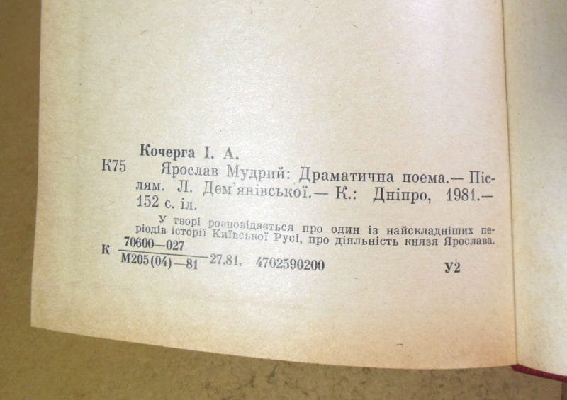 Кочерга І. Ярослав Мудрий. Драматична поема.  К. Дніпро 1981г. 152 с., іл. Палiтурка: Тверда, Зменшений формат