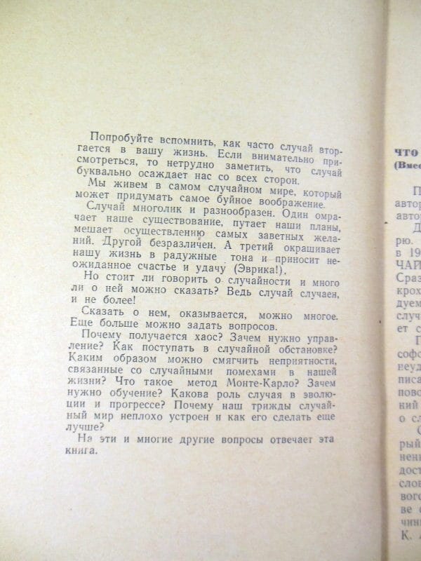 Случай многолик и разнообразен. Один омрачает наше существование, путает наши планы, мешает осуществлению самых заветных желании. Другой безразличен. А третий окрашивает нашу жизнь в радужные тона и приносит неожиданное счастье и удачу. Как поступать в случайной обстановке? Как можно смягчить неприятности, связанные со случайными помехами в нашей жизни? Что такое метод *Монте-Карло*? Какова роль случая в эволюции и прогрессе?