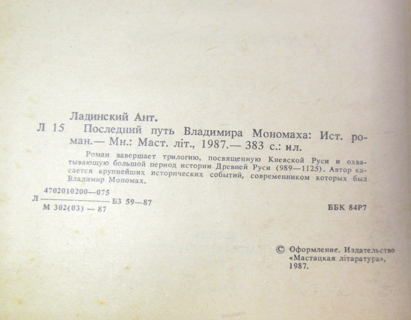 Ладинский А. Последний путь Владимира Мономаха. Исторический роман Минск Мастацкая лiтаратура 1987г. 383 с. Палiтурка / переплет: Твердый, Обычный формат.