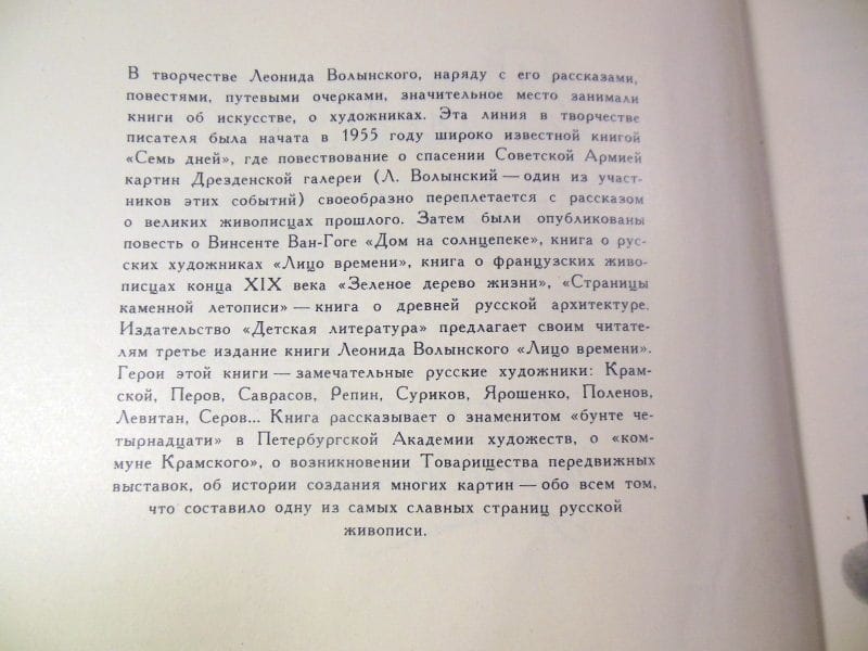 В творчестве Леонида Волынского, наряду с его рассказами, повестями, путевыми очерками, значительное место занимали книги об искусстве, о художниках. Эта линия в творчестве писателя была начата в 1955 году широко известной книгой Семь дней, где повествование о спасении Советской Армией картин Дрезденской галереи (Л. Волынский — один из участников этих событий) своеобразно переплетается с рассказом о великих живописцах прошлого. Затем были опубликованы повесть о Винсенте Ван-Гоге Дом на солнцепеке, книга о русских художниках Лицо времени, книга о французских живописцах конца XIX века Зеленое дерево жизни, Страницы каменной летописи — книга о древней русской архитектуре. Издательство Детская литература предлагает своим читателям третье издание книги Леонида Волынского Лицо времени. Герои этой книги — замечательные русские художники: Крамской, Перов, Саврасов, Репин, Суриков, Ярошенко, Поленов. Левитан, Серов… Книга рассказывает о знаменитом бунте четырнадцати…