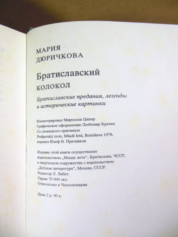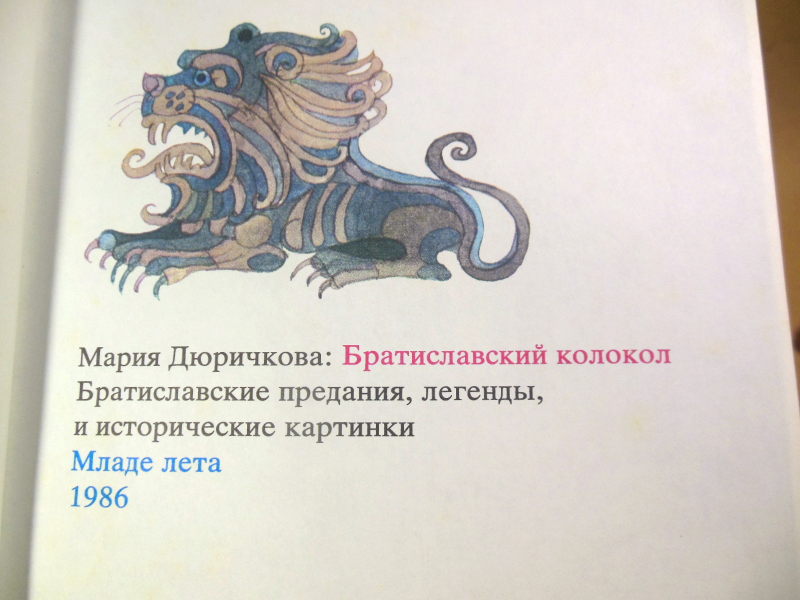 Дюричкова М. Братиславский колокол. Братиславские предания, легенды и исторические картинки. Иллюстрации Miroslav Cipar (Мирослав Ципар). Братислава Младе лета 1986г. 160 с., цв. илл. Твердый переплет, Энциклопедический формат.