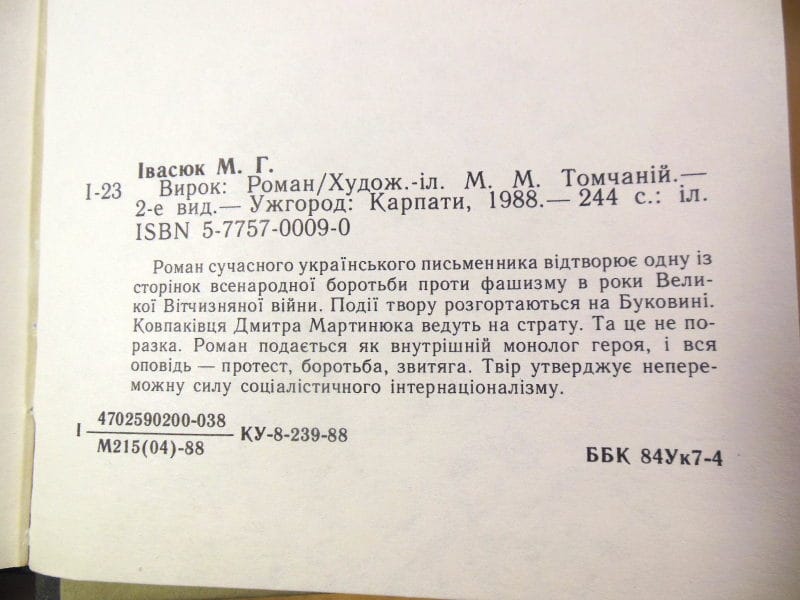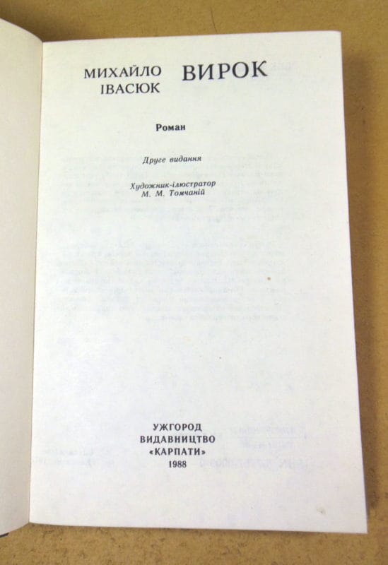 Івасюк М. Вирок. 2-ге вид. Художник-ілюстратор М.Томчаній. Ужгород Карпати 1988 г. 244 с., іл. Палiтурка: Тверда, Зменшений формат.