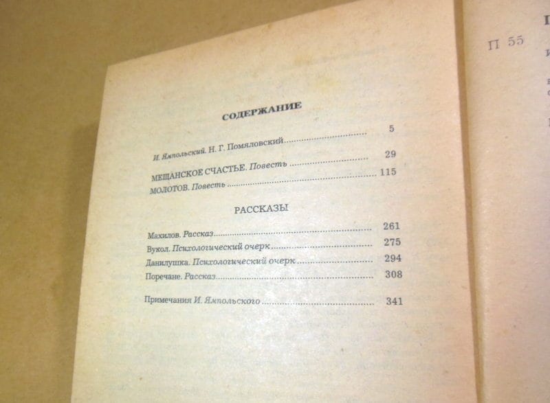 В сборник произведений писателя-демократа 60-х годов 19 века Н.Г. Помяловского (1835 — 1863) вошли повести «Мещанское счастье», «Молотов», рассказы «Махилов», Поречане» и другие