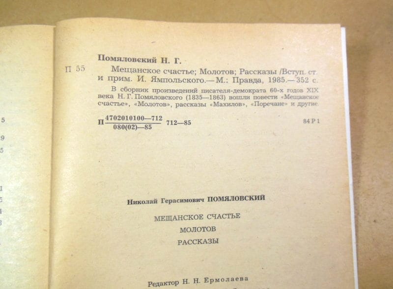 Помяловский Н. Г. Мещанское счастье. Молотов. Рассказы. Вступит. статья и примеч. И. Ямпольского. М. Правда. 1985г. 352 с. Мягкий (бумажный) переплет, обычный формат.