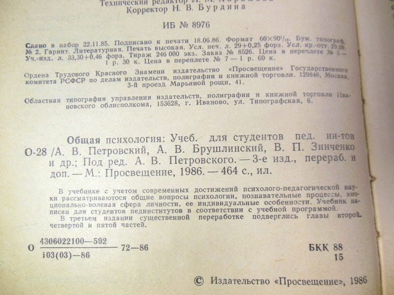 Петровский А.В., Брушлинский А.В., Зинченко В.П. и др. Общая психология. Учебник для студентов педагогических институтов. Под ред. А.В.Петровского. Издание 3-е, перераб.и доп. М Просвещение. 1986г. 464с., ил. твердый заламинированный переплет, немного увеличенный формат.