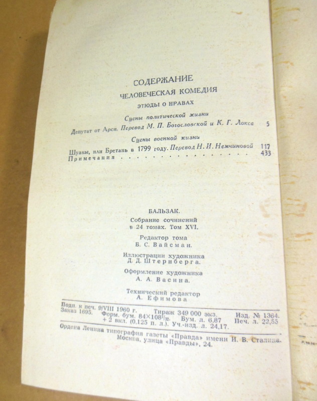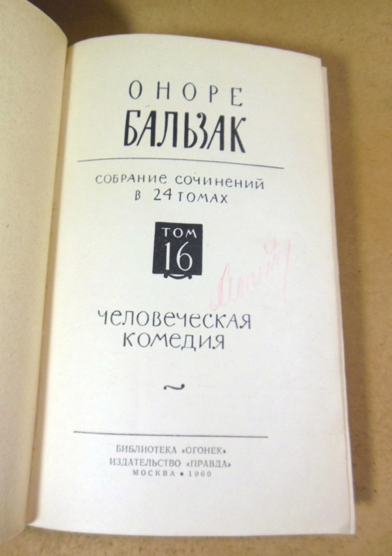 Оноре Бальзак. Собрание сочинений в 24 томах. Том 16. Человеческая комедия. М.: Правда, 1960. 440 с. Твердый переплет, Обычный формат