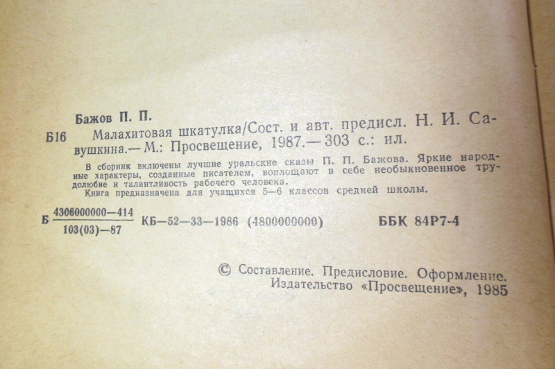 Бажов П. П. Малахитовая шкатулка. М.: Просвещение, 1987. 303 с. Твердый переплет, слегка увеличенный формат.