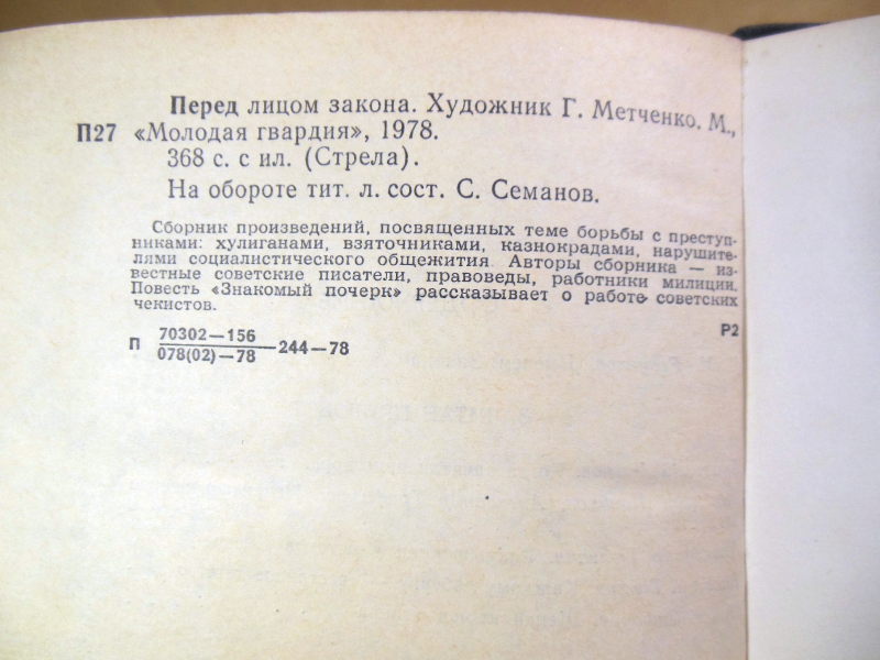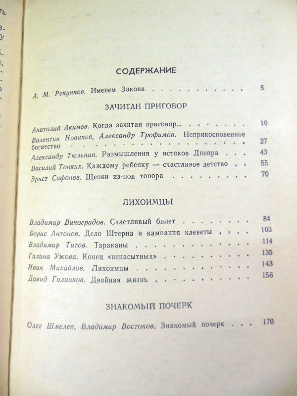 Сборник произведений, посвященных теме борьбы с преступниками: хулиганами, взяточниками, казнокрадами, нарушителями социалистического общежития. Авторы сборника — известные советские писатели, правоведы, работники милиции. Повесть `Знакомый почерк` рассказывает о работе советских чекистов. В сборник вошли произведения: А.Акимова Когда зачитан приговор, В.Новикова и А.Трофимова Неприкосновенное богатство, А.Тюльпина Размышления у истоков Днепра, В.Тонких Каждому ребенку — счастливое детство, Э.Сафонова Щепки из-под топора, В.Виноградова Счастливый билет, Б.Антонова Дело Штерна и кампания клеветы, В.Титова Тараканы, Г.Ужовой Конец ненасытных, И.Михайлова Лихоимцы, Д.Голинкова Двойная жизнь, О.Шмелева и В.Востокова Знакомый почерк.