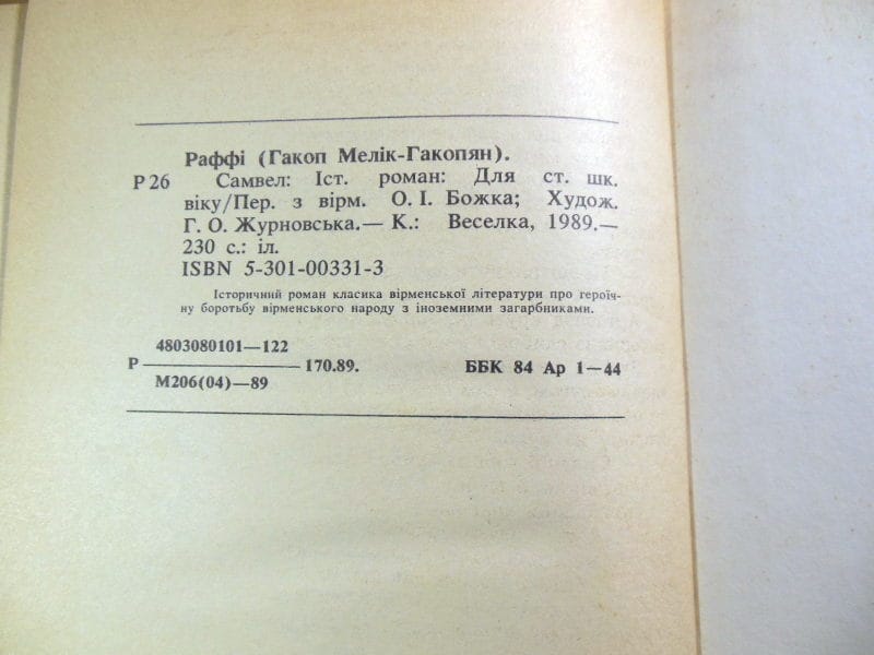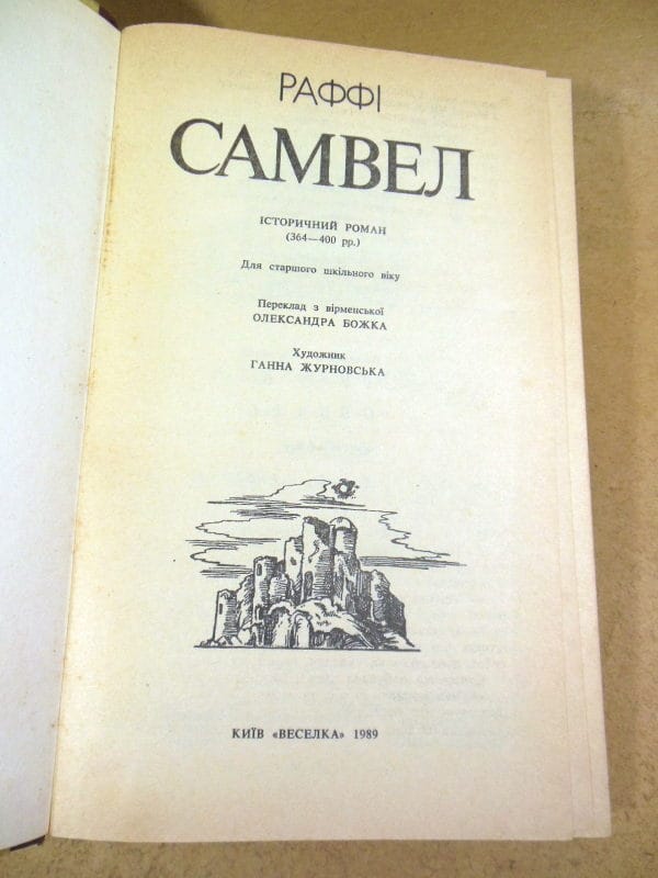 Раффі. Самвел. Історичний роман (364 — 400 рр.). Для сер.ст.віку. Переклад з вірменської. Худ. Г.Журновська. Київ Веселка 1989г. 230 с. Палiтурка: Картонна, корінець тканинний, звичайний формат.