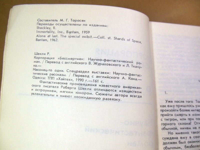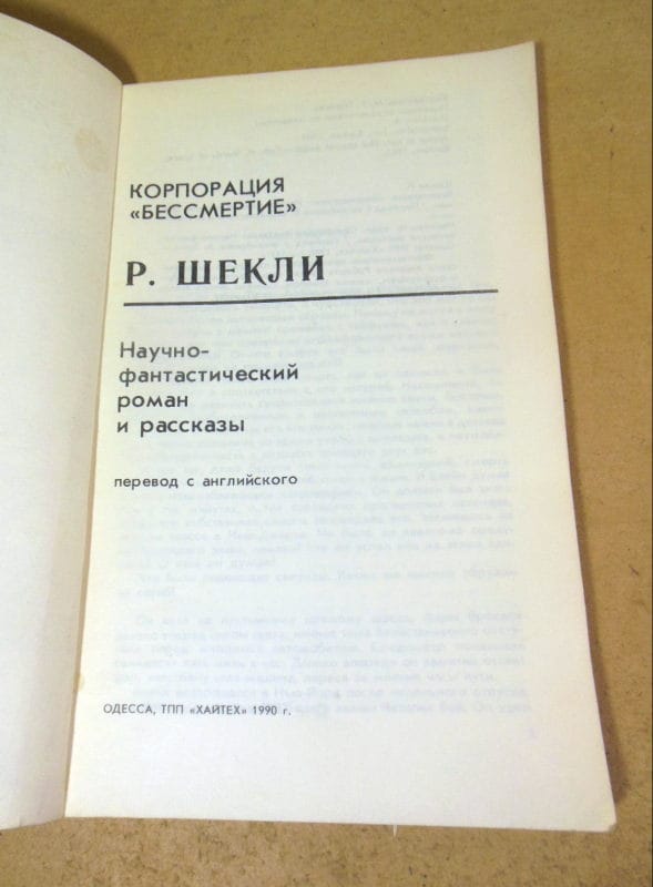 Шекли Р. Корпорация «Бессмертие». Научно-фантастический роман и рассказ. Серия «Мастера фантастики», т.1. Одесса, ТПП «ХАЙТЕХ», 1990 г. Мягкая обложка, обычный формат