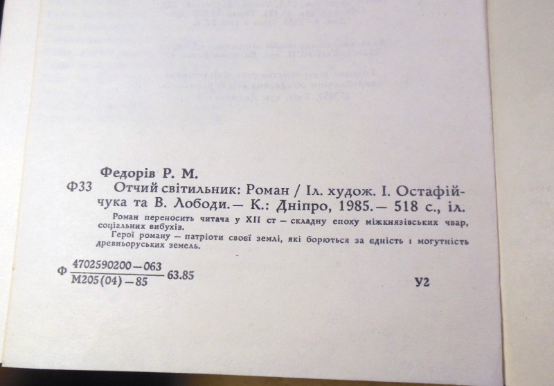 Федорів P. М. Отчий світильник. Роман. / Іл. худож. І. Остафійчука та В. Лободи. Київ Дніпро. 1985г. 518 с. іл. звичайний формат