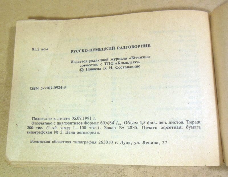 Русско-немецкий разговорник. Луцк: Редакция журнала «Вітчизна» совместно с ТПО «Комплекс», 1991. 144 с. (4,5 физ. печ. л.). Мягкая обложка, уменьшенный горизонтальный формат