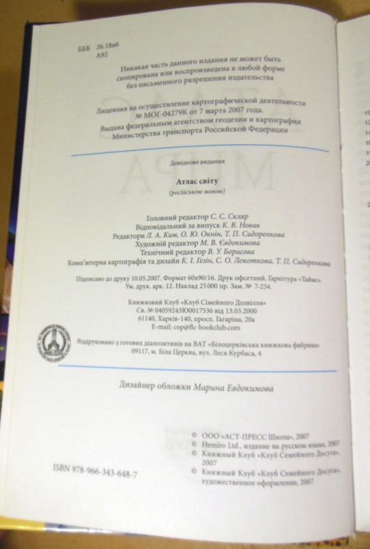 С. С. Скляр (ред.). Атлас мира. Харьков: Книжный Клуб «Клуб Семейного Досуга», 2007. 192 с. Твердый переплет, Обычный формат.