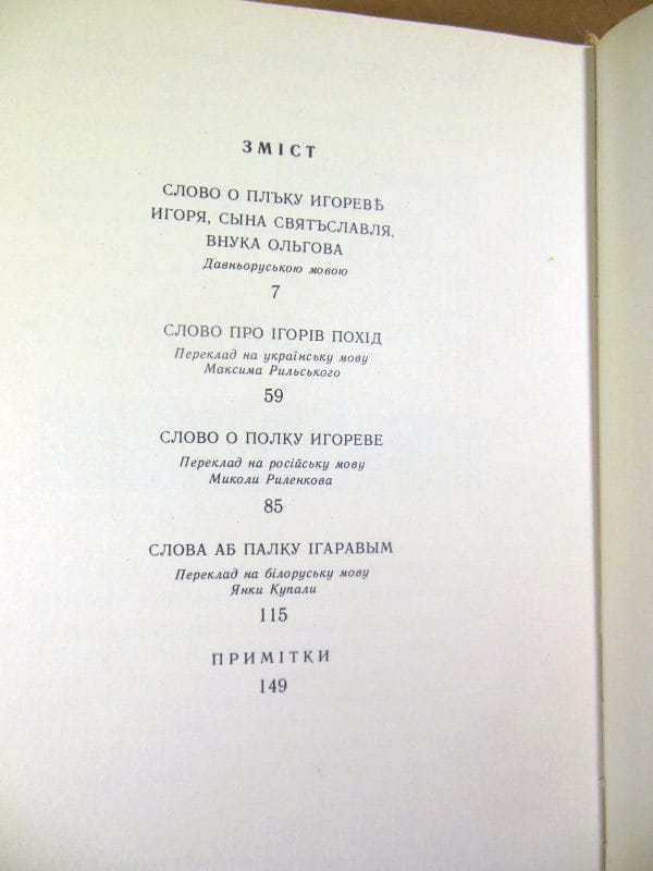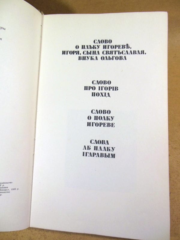 В основу этого уникального издания положен величайший памятник древнерусской литературы XII века «Слово о полку Игореве». Текст произведения представлен на языке оригинала, а также в классических переводах на украинский (М. Рыльского), русский (Н. Заболоцкого) и белорусский (Я. Купалы) языки.