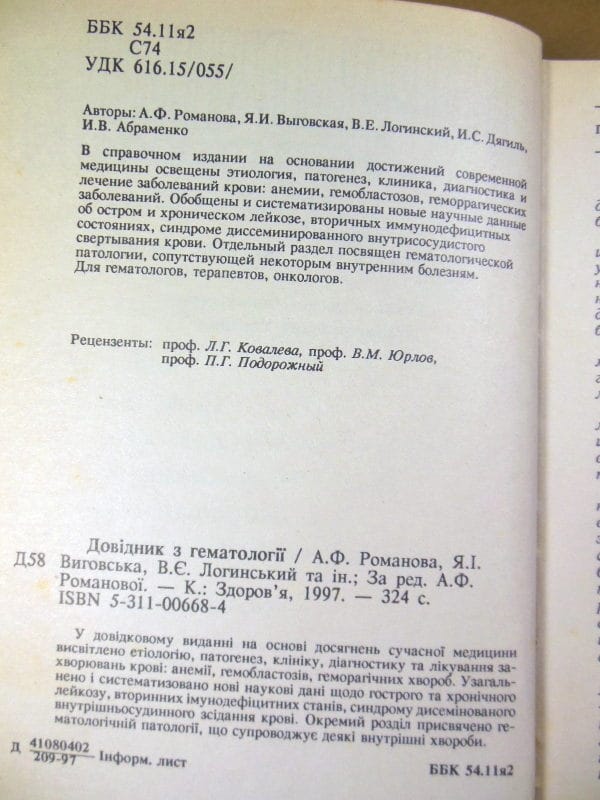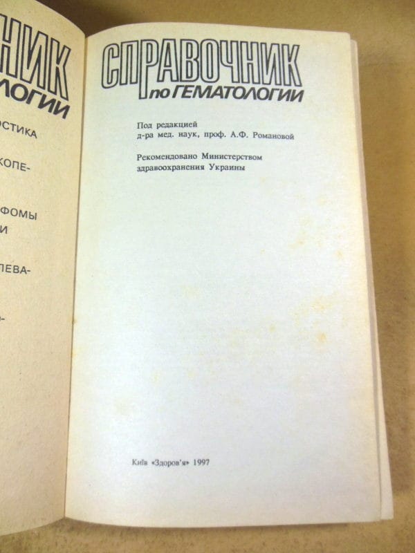 Справочник по гематологии. Под ред. д-ра мед. наук, проф. А.Ф. Романовой. Рекомендован МЗ Украины. Киев: «Здоров’я», 1997г. 324 с. Переплет: Твердый.обычный формат.