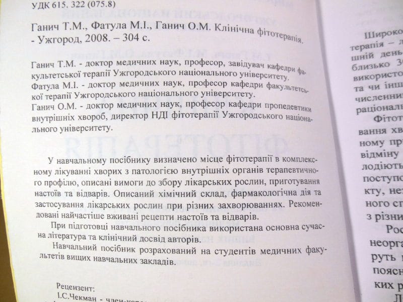 У навчальному посібнику визначено місце фітотерапії в комплексному лікуванні хворих із патологією внутрішніх органів терапевтичного профілю. Авторами описані вимоги до збору лікарських рослин, технологія приготування настоїв та відварів, їхній хімічний склад, фармакологічна дія та застосування при різних захворюваннях. Видання містить рекомендації щодо найчастіше вживаних рецептів і базується на сучасних літературних даних та клінічному досвіді авторів.