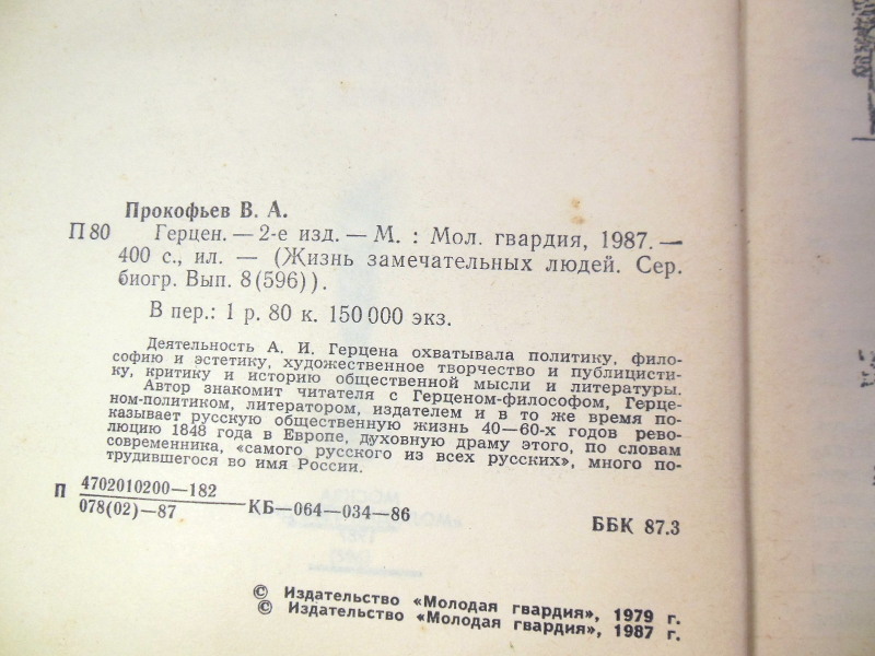 Прокофьев В. Герцен. Жизнь замечательных людей. Серия биографий. Выпуск 8 (596). М.: Молодая гвардия. 1987г. 400 с., илл. Твердый переплет, обычный формат.