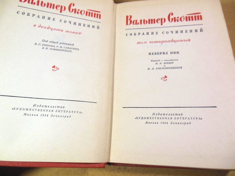 Скотт В. Собрание сочинений в двадцати томах. Том 14. «Певерил Пик». Перевод с английского М.И. Беккер и Н.Л. Емельянниковой. Москва, Ленинград. Государственное издательство художественной литературы. 1964 г. 704 с. Твердый переплет, Обычный формат.