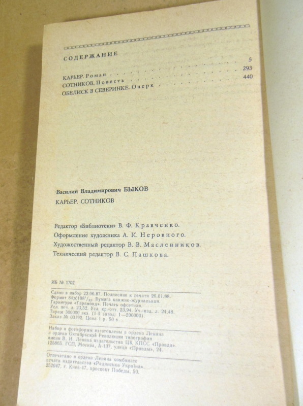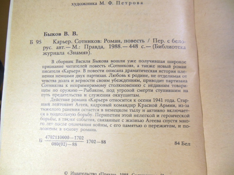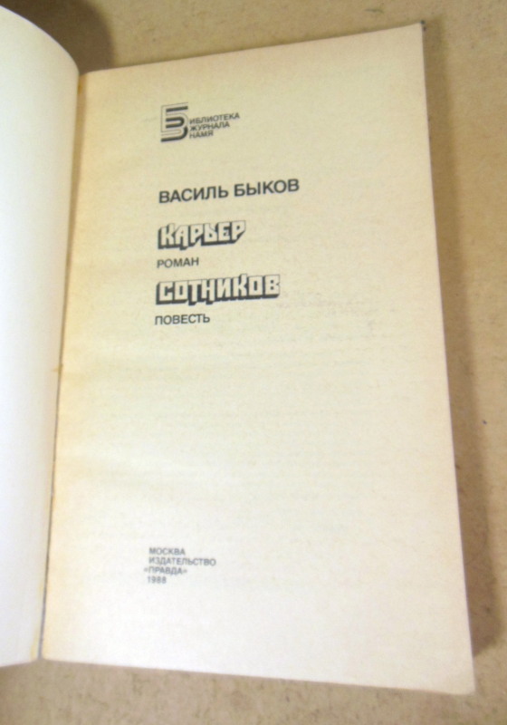 В сборник В. Быкова вошли уже получившая широкое признание читателей повесть Сотников, а также новый роман писателя Карьер. В повести описана драматическая история пленения немцами двух партизан. Любовь к родине, не отделимая от чувства долга и верности своим убеждениям, приводит партизана Сотникова к непримиримому столкновению с недавним товарищем по оружию — Рыбаком, под угрозой смерти ступившим на путь предательства и служению оккупантам. Действие романа Карьер относится к осени 1941 года. Старший лейтенант Агеев, кадровый командир Красной Армии, из-за тяжелого ранения остается в немецком тылу и активно включается в подпольную борьбу. Перипетии этой нелегкой и героической борьбы, а также события, связанные с жизнью Агеева спустя много лет после окончания войны, с его памятью о пережитом, и положены в основу романа