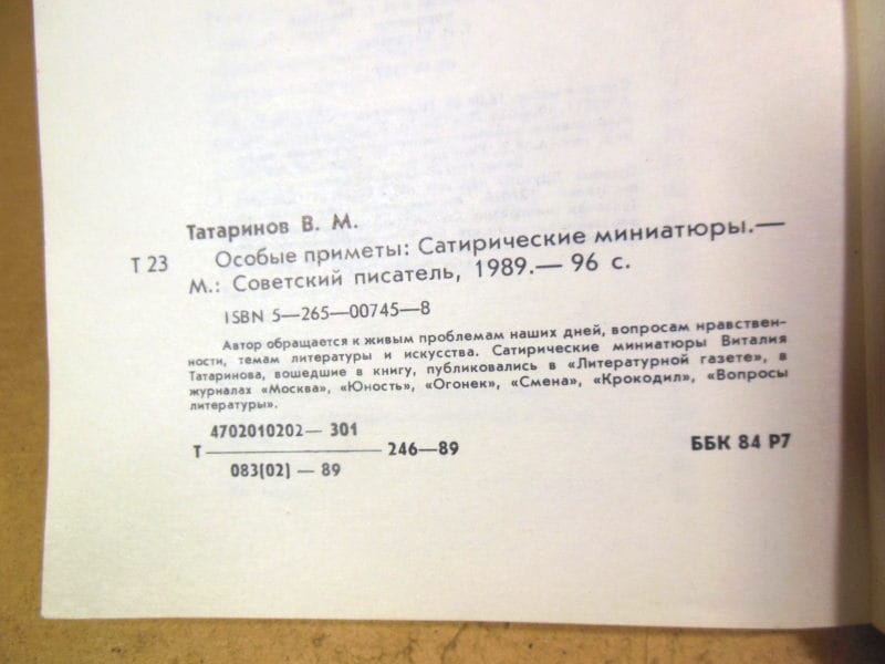 Татаринов В. М. Особые приметы: Сатирические миниатюры. М.: Издательство «Советский писатель», 1989 г., 96с. Мягкий переплет, уменьшенный формат.