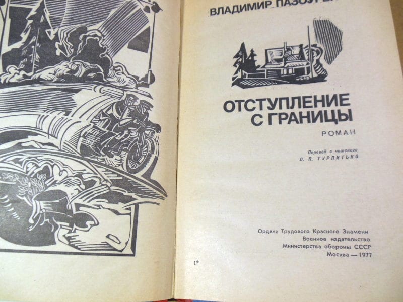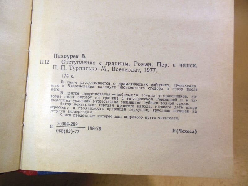 Пазоурек В. Отступление с границы. Роман. Перевод с чешского. М., Воениздат, 1977 г., 174 с., твердый переплет, обычный формат.
